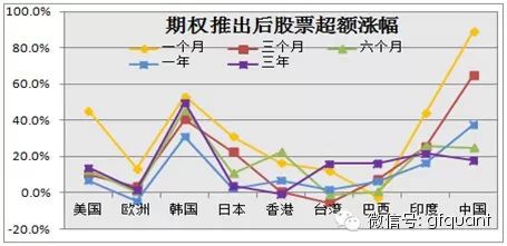 经统计,海外个股期权的推出能够刺激股票价格,这一结论几乎适用于所有交易所,其中印度、中国(权证)以及日本等国家股价的反映最为激烈,美国、巴西以及香港等成熟市场表现则较为平稳。